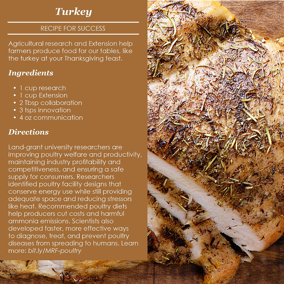 With a little collaboration and innovation, and a dash of communication, agricultural research and Extension help farmers produce food for our tables, including the dishes at your Thanksgiving feasts. Check out the research behind the ingredients in some of the most popular Thanksgiving dishes.